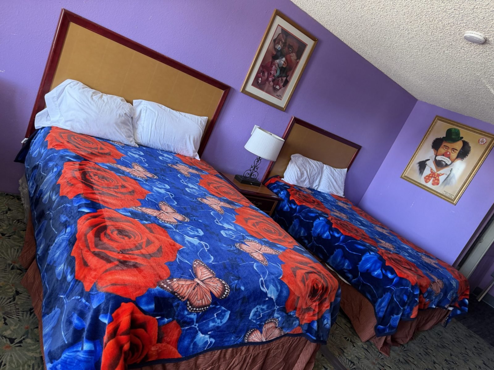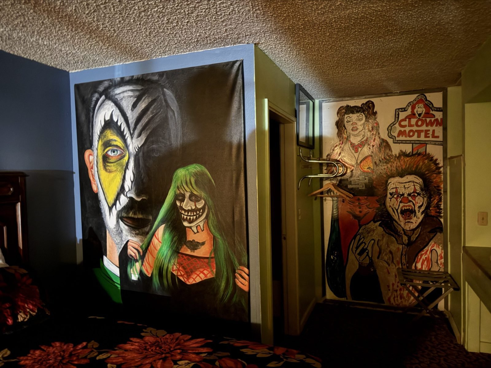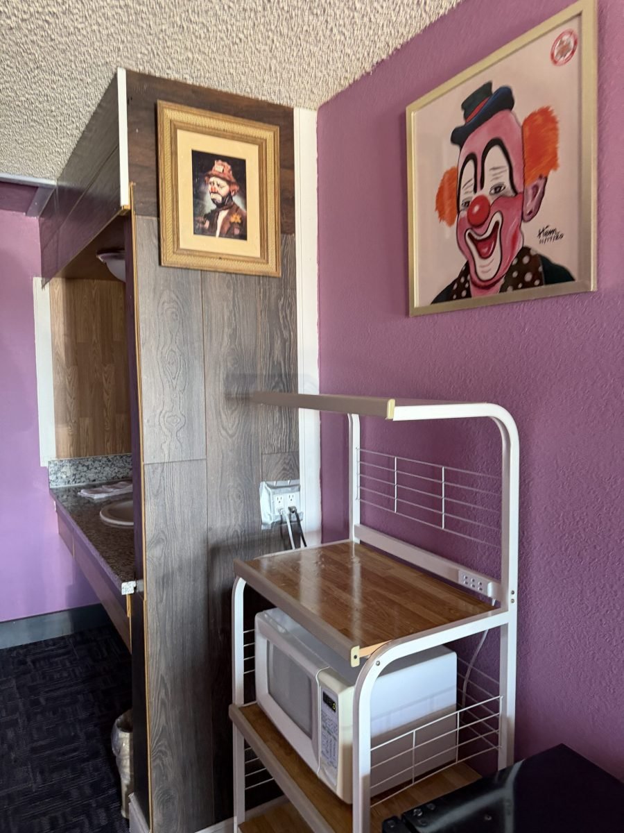 The official room setup is straightforward, with heating and cooling, a TV, fridge, microwave, and coffee maker. That ordinary layout creates a sharp contrast with the decor. You might be in a room that otherwise feels familiar, yet clown art on the wall keeps nudging the brain in the wrong direction.