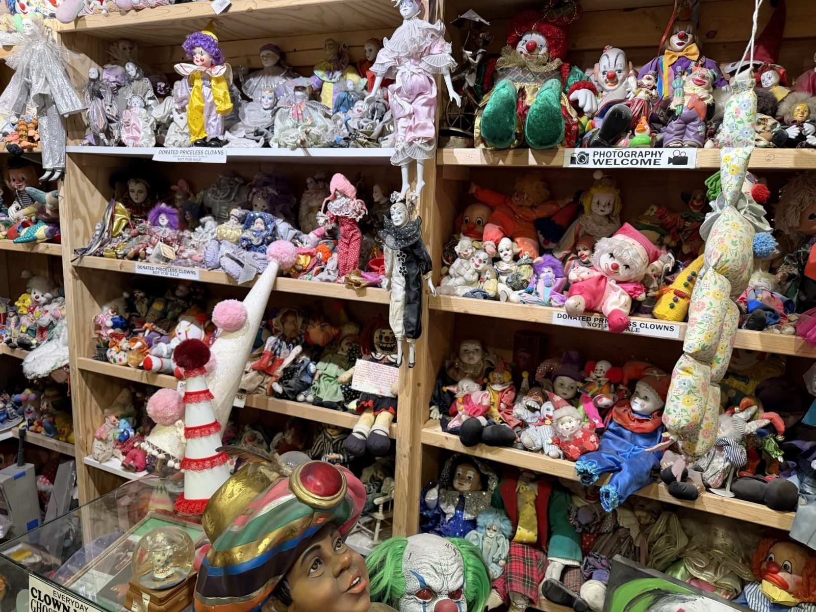 That origin matters because it explains why the motel doesn’t feel like a theme slapped onto a generic building. The clown collection came first, then the legend followed. Visitors also added to the pile over the years, which helped transform the property into a kind of unofficial clown museum with glass cases, shelves, wall art, dolls, masks, and figurines filling shared spaces.