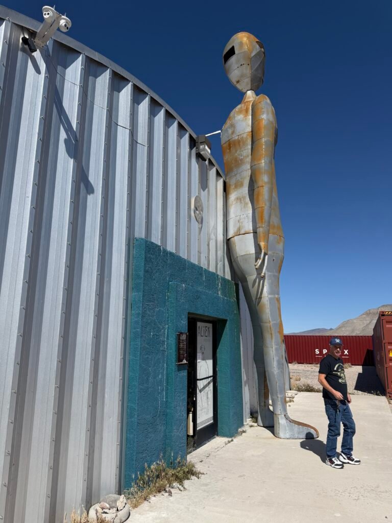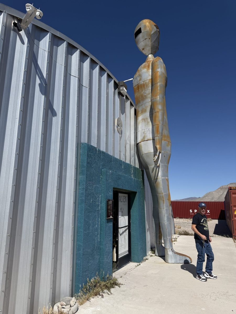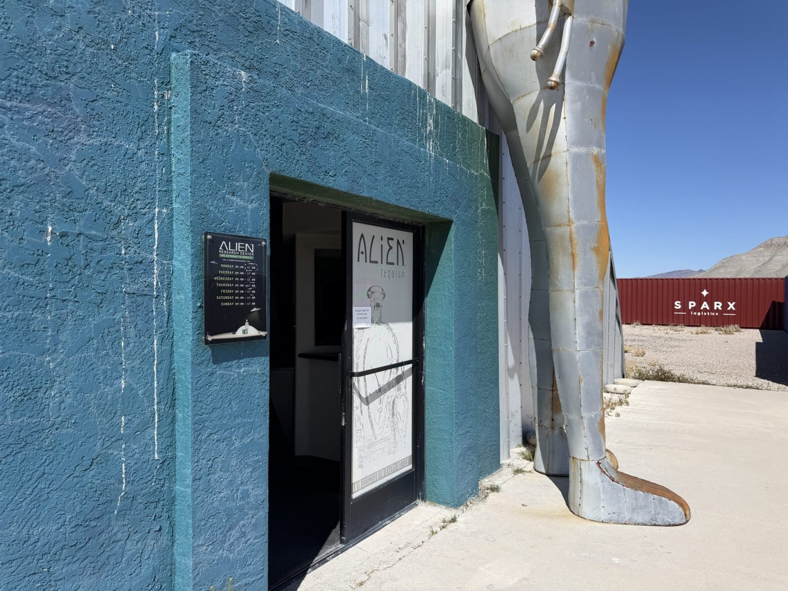 The Alien Research Center, near the southern approach, is another easy stop. Despite the name, it’s a gift shop, not a lab, and that’s part of its charm. A giant alien statue rises beside the building, giving drivers the kind of roadside absurdity that feels perfect here. You can browse shirts, novelty signs, and UFO-themed souvenirs, then step back outside to photograph the desert around it.